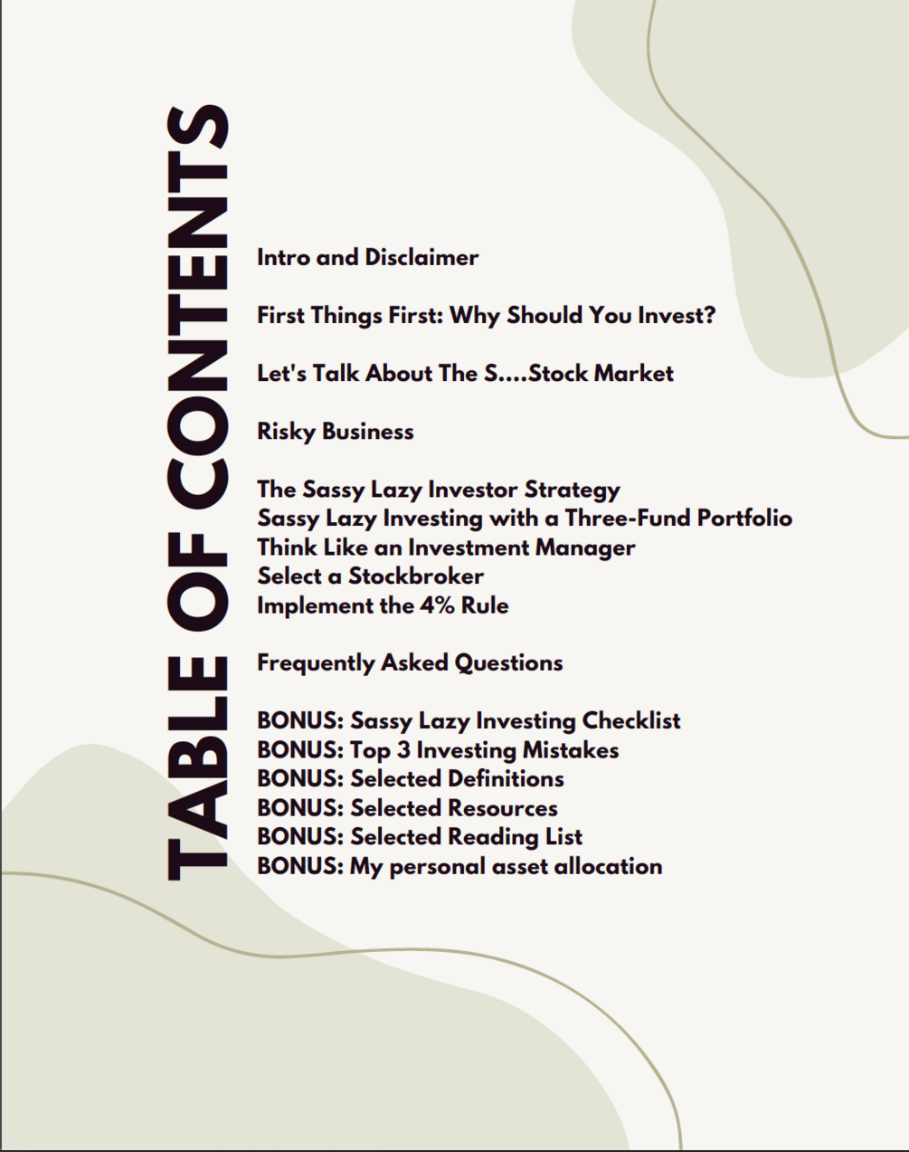 Sassy Lazy Investing is a minimal approach to get start with investing. I guide you how the stock market works and show discuss how I easily set up a portfolio that helps me achieve my goals. Please note that this guides is not financial advice -- you are responsible for your own actions. This guide is for educational purposes only.